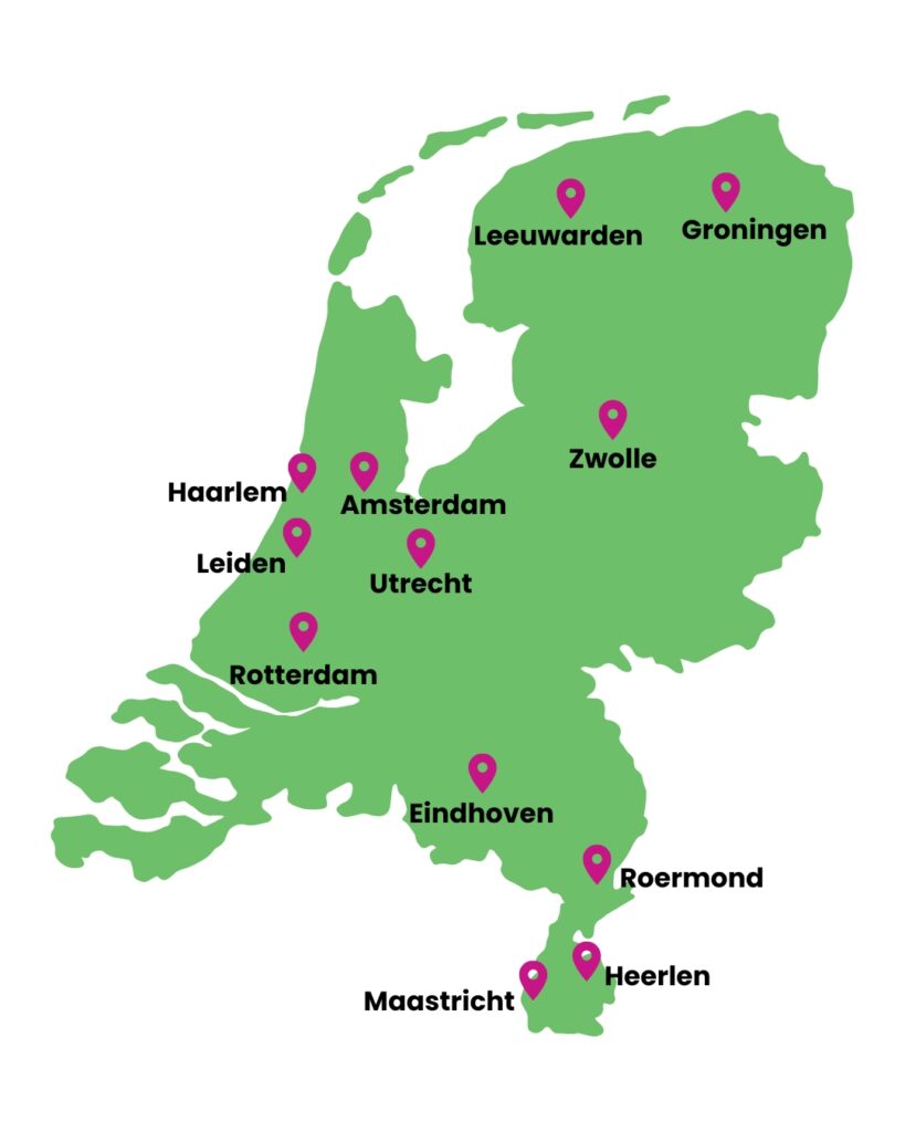 @ease zit door heel Nederland. Hier vind je onze locaties: Amsterdam Eindhoven Groningen Haarlem Heerlen Leeuwarden Leiden Maastricht Roermond Rotterdam Utrecht Zwolle
